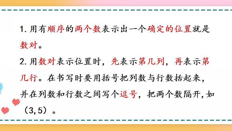 1.用有顺序的两个数表示出一个确定的位置就是数对。2.用数对表示位置时,先表示第几列,再表示第几行。在书写时要用括号把列数与行数括起来,并在列数和行数之间写个逗号,把两个数隔开,如(3,5)。