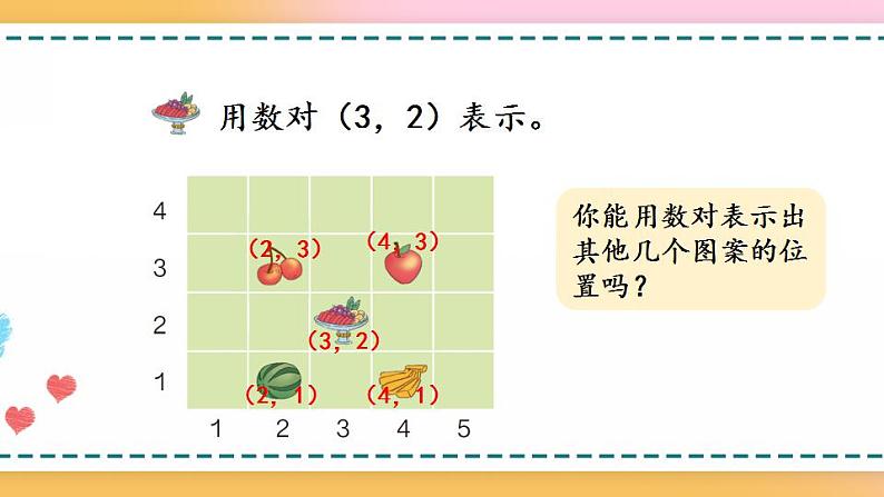 利用数对描述各点的位置时,先写列数再写行数,中间用“,”隔开。