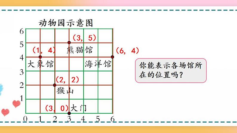 这是一份人教版五年级上册2 位置教学ppt课件,共16页。PPT课件主要包含了动物园示意图,列数行数,同一行,思路分析,⑭k6,⑧J5,⑳I4等内容,欢迎下载使用。