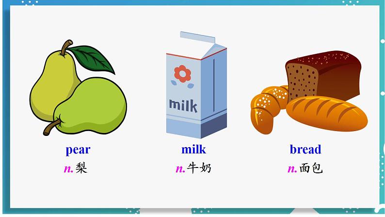 这是一份2021学年Section A说课ppt课件,共19页。PPT课件主要包含了New words,pears梨复数,pear 梨,salad 沙拉,milk 牛奶,bread 面包,Words Game,Yes l do,Group Work等内容,欢迎下载使用。