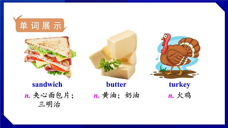 展开Unit 8 How do you make a banana milk shake?Section B 1a-1e情景导入T :Good morning / afternoon,boys and girls. Do you like to have sandwiches?What do you like to have in your sandwiches?S1:I like some meat in the sandwiches.S2:I like some cabbage in the sandwiches.T :Let's go on learning Section B to see how to make the sandwiches.n. 夹心面包片; 三明治sandwich butter turkey n. 黄油;奶油n. 火鸡单词展示n. 莴苣;生菜lettuce piecen. 片;块;段生成新知Make a list of things you like in a sandwich.In my sandwich, I like_______________________________________________________________tomatoes, lettuce and turkey , but I don’t like butter or onion.Ask and answer questions with a partner. Find out what he / she likes in a sandwich.Yes, I do.Do you like lettuce in a sandwich?Do you like tomatoes?No, I don’t.Do you like tomatoes in a sandwich?No, I don’t.Do you like onion?Yes, I do.Role-playLook at the picture in 1a. Listen and circle the words you hear. Listen again. Write the ingredients in the order you hear them. a piece of breadtomatoonioncheeselettuceanother piece of breadTapescripts:Tell your partner how to make a cheese sandwich.How much butter?First, put some butter on a piece of bread.About one spoon.How to make a simple sandwich?1. First, put some butter on a piece of bread.2. Next, cut up a tomato. Put the tomato on the bread.3. Next, put some turkey pieces.4. Then, put some butter on the turkey pieces.5. Finally, put another piece of bread.▲可数名词,意为“段、块、片、张、条、件、篇”。表示不可数名词的量时,可用“基数词+piece(s)+of+不可数名词”,可数名词也可用此结构。如:a piece of paper / advice / news / bread / meat / music / furniture一张纸/一条建议/一条消息/一块面包/一块肉/一曲音乐/一件家具piece的用法问题探究随堂练习Ⅰ. 根据句意及汉语提示完成句子。1. What do you like in your ____________(三明治)?2. How much ________(黄油) do you need?3. Here are three ________(片) of bread on the table.4. I like vegetables very much, especially________(莴苣). sandwichesbutterpieceslettuceⅡ. 翻译句子。1. 谢谢你给我制作三明治。 ________________________________________________2. 在做沙拉之前,检查一下所有的原料。 ________________________________________________ ________________________________________________Thank you for making the delicious sandwich for me.Before you make the salad, check you have all the ingredients.3. —首先,把一些黄油放到一片面包上。 —多少黄油呢? —大约一匙。 —______________________________________________ —______________________________________________ —______________________________________________First, put some butter on a piece of bread.How much butter?About one spoon.