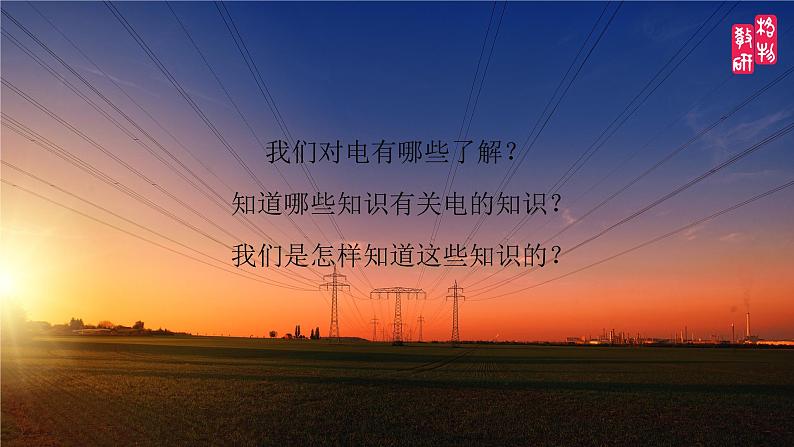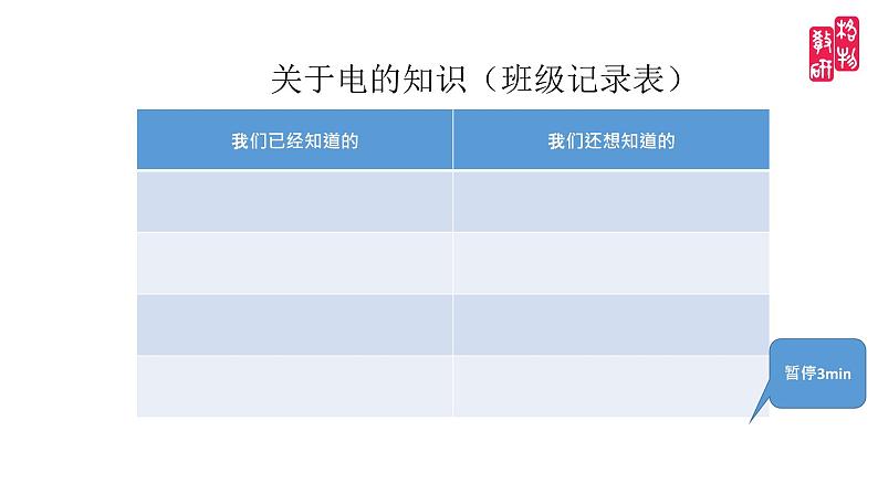 这是一份科学四年级下册1.电和我们的生活背景图ppt课件,共13页。PPT课件主要包含了我们对电有哪些了解,暂停3min,用电安全提示,实验室排插等内容,欢迎下载使用。