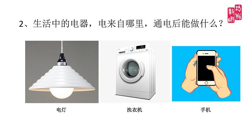 2、生活中的电器,电来自哪里,通电后能做什么?