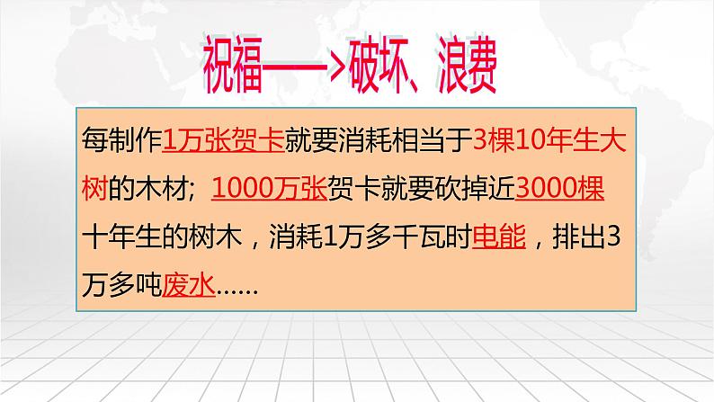 每制作1万张贺卡就要消耗相当于3棵10年生大树的木材; 1000万张贺卡就要砍掉近3000棵十年生的树木,消耗1万多千瓦时电能,排出3万多吨废水……