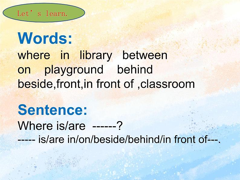 2. 能力目标:学生可以通过所学,用英语询问对方所在的位置。