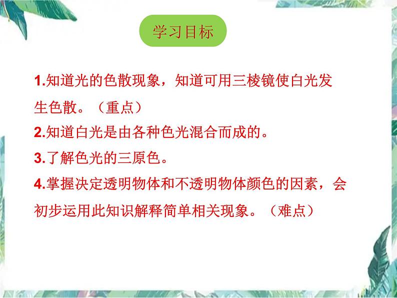 1.知道光的色散现象,知道可用三棱镜使白光发 生色散。(重点)2.知道白光是由各种色光混合而成的。3.了解色光的三原色。4.掌握决定透明物体和不透明物体颜色的因素,会初步运用此知识解释简单相关现象。(难点)