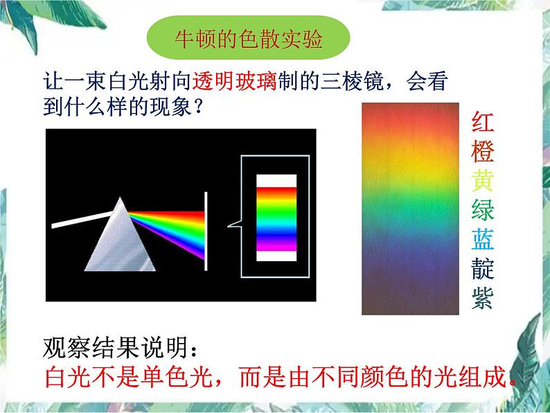 观察结果说明:白光不是单色光,而是由不同颜色的光组成。