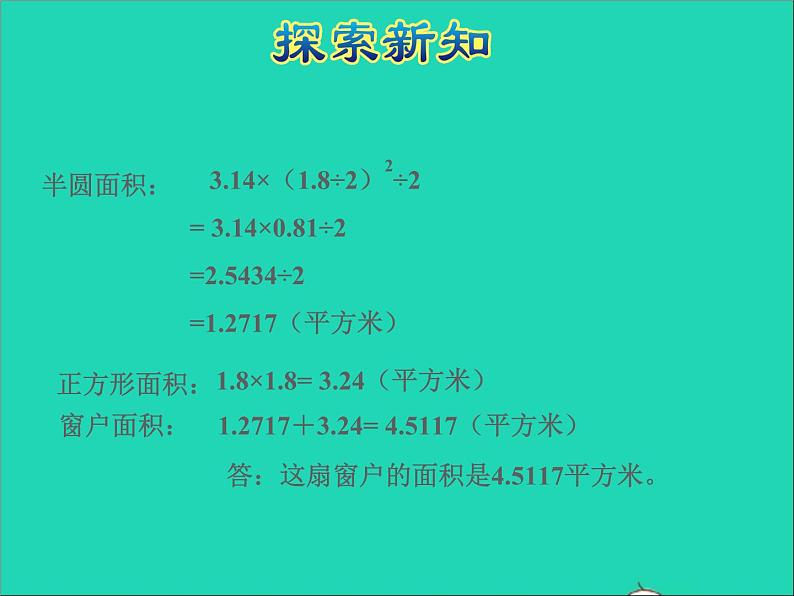 3.14×(1.8÷2)2÷2= 3.14×0.81÷2=2.5434÷2=1.2717(平方米)