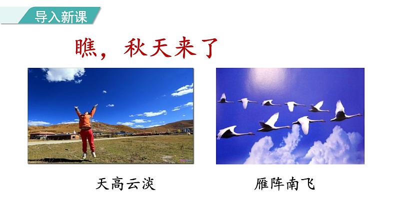 天 空 那 么 蓝,那 么 高。一 群 大 雁 往 南 飞,一 会儿 排 成 个“人〞 字,一 会儿 排 成 个 “一〞 字。 啊!秋 天 来 了!