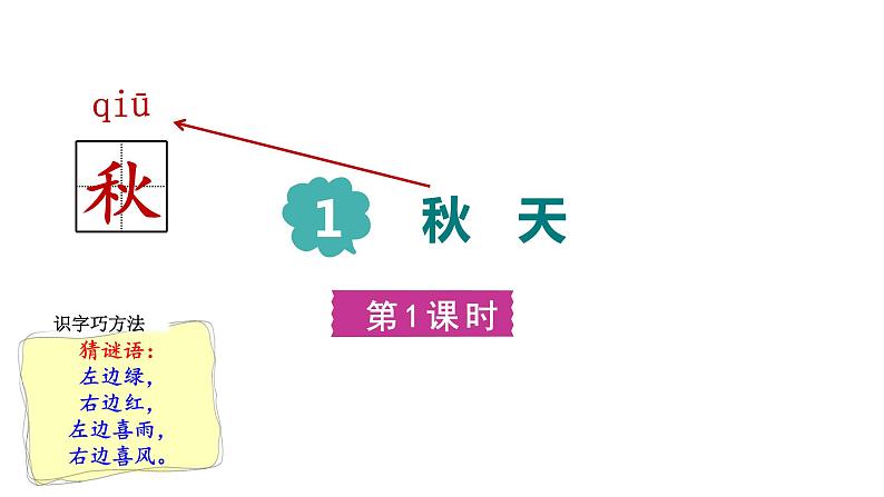 这是一份人教部编版一年级上册1 秋天图文课件ppt,共9页。PPT课件主要包含了五彩缤纷,硕果累累,秋风秋收秋千,秋=禾+火,表示谷物成熟,四季中的第三季,大会气,一+人,人+云,树=木+对等内容,欢迎下载使用。