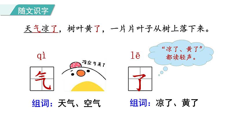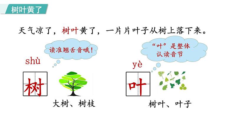 天 气 凉 了, 树 叶 黄 了,一 片 片 叶 子 从 树 上 落 下 来。