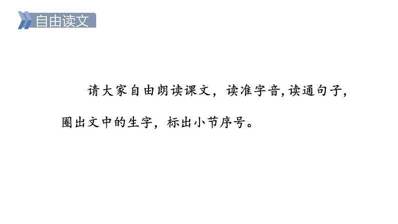 请大家自由朗读课文,读准字音,读通句子,圈出文中的生字,标出小节序号。