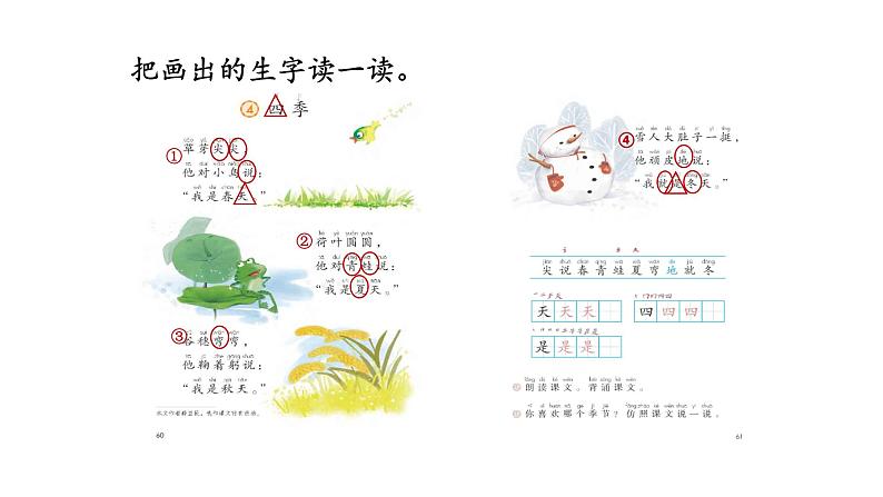 春 雪人 圆圆夏 草芽 大肚子一挺秋 荷叶 弯弯冬 谷穗 尖尖
