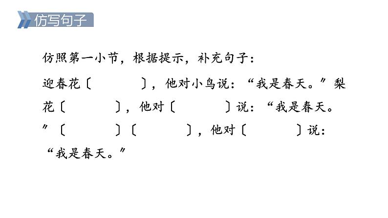 仿照第一小节,根据提示,补充句子:迎春花〔 〕, 他对小鸟说:“我是春天。〞梨花〔 〕, 他对〔 〕说:“我是春天。〞〔 〕〔 〕,他对〔 〕说:“我是春天。〞