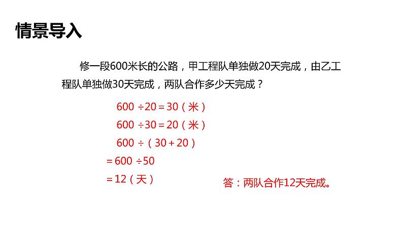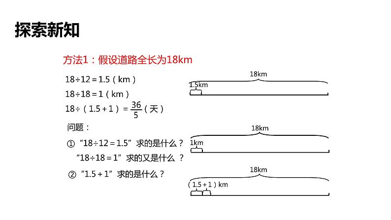 ③如果知道了这两个信息,这个问题可以怎样解决? (这条路的长度÷(一队1天修的长度 + 二队1天 修的长度))