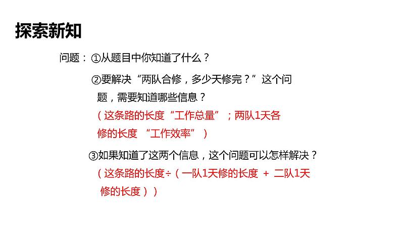 ②要解决“两队合修,多少天修完?”这个问 题,需要知道哪些信息? (这条路的长度“工作总量”;两队1天各 修的长度 “工作效率”)