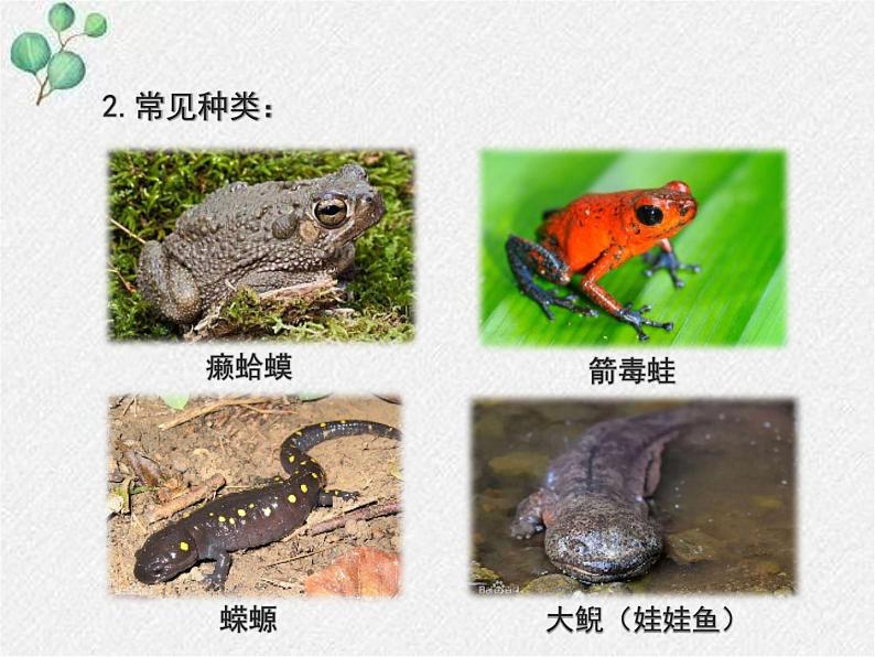 ① 幼体用鳃呼吸,成体用肺呼吸,皮肤裸露有辅助呼吸的作用;