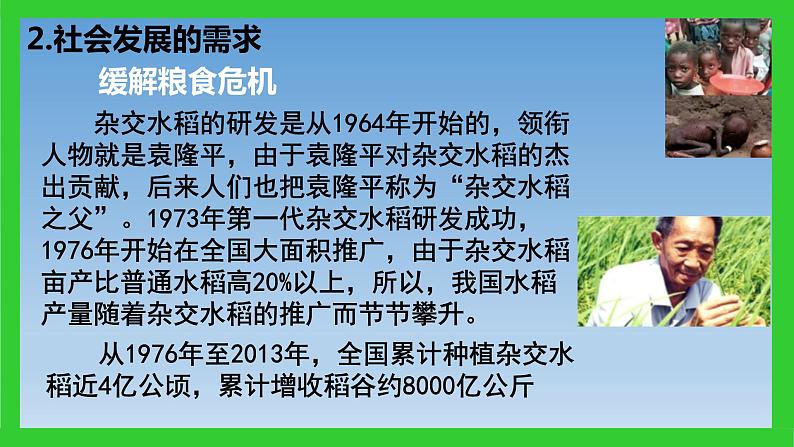 从1976年至2013年,全国累计种植杂交水稻近4亿公顷,累计增收稻谷约8000亿公斤