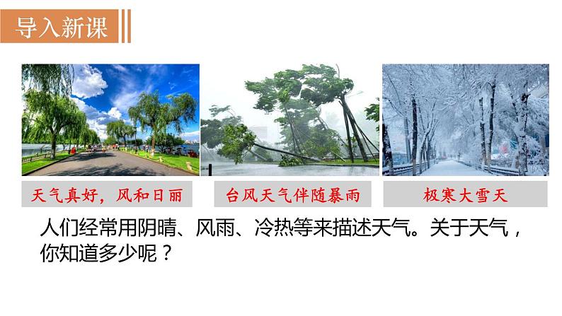 这是一份地理人教版 (新课标)第一节 多变的天气教学ppt课件,共33页。PPT课件主要包含了天气及其影响,大风天气,大雨天气,天气的特点,北京的冬天寒冷干燥,戴口罩出行,四季如春的昆明,西藏终年积雪,生活小提示,天气符号等内容,欢迎下载使用。