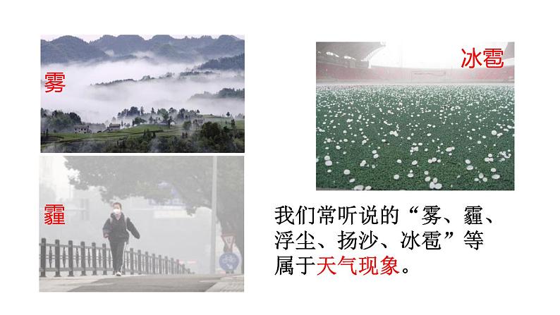 我们常听说的“雾、霾、浮尘、扬沙、冰雹”等属于天气现象。