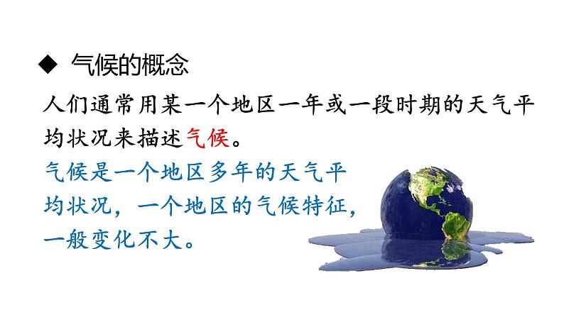 人们通常用某一个地区一年或一段时期的天气平均状况来描述气候。气候是一个地区多年的天气平均状况,一个地区的气候特征,一般变化不大。