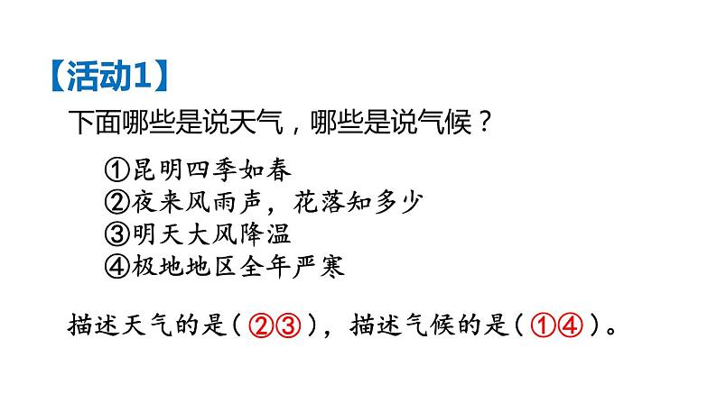 ②夜来风雨声,花落知多少③明天大风降温④极地地区全年严寒