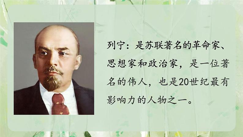 列宁:是苏联著名的革命家、思想家和政治家,是一位著名的伟人,也是20世纪最有影响力的人物之一。