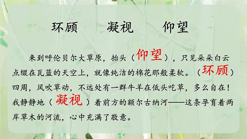 来到呼伦贝尔大草原,抬头( ),只见朵朵白云点缀在瓦蓝的天空上,就像纯洁的棉花那般柔软。( )四周,风吹草动,不远处有一群牛羊在低头吃草,多么自在!我静静地( )着前方的额尔古纳河——这条孕育着两岸草木的河流,心中充满了敬意。