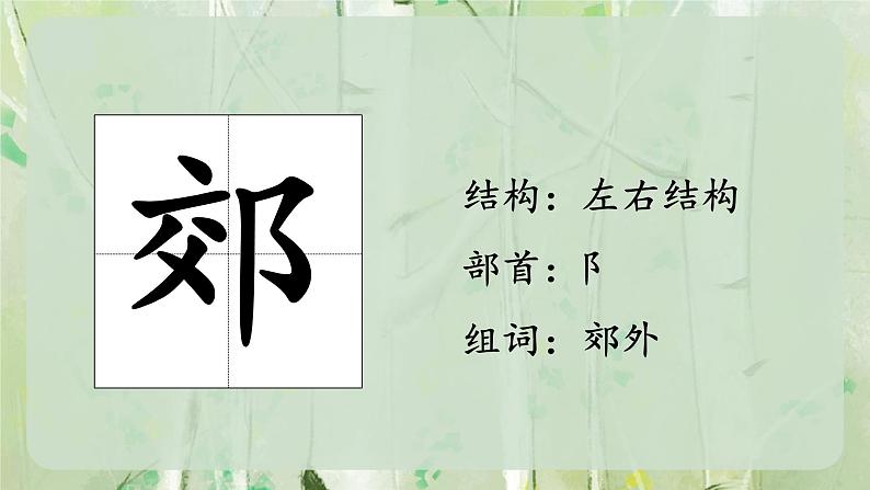 结构:左右结构部首:阝组词:郊外