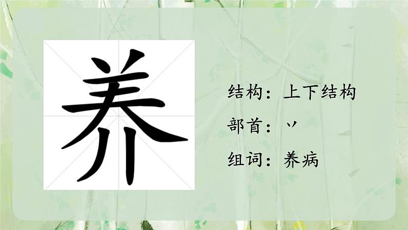 结构:上下结构部首:丷组词:养病