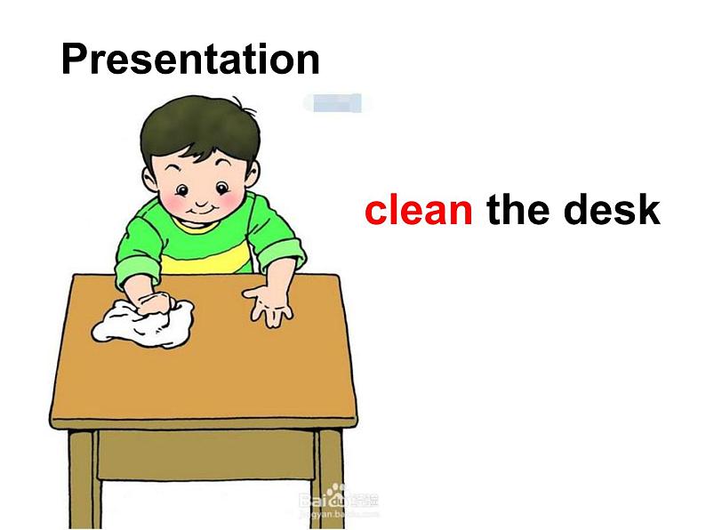 Clean,clean,clean the desk,let's clean the teacher's desk.
