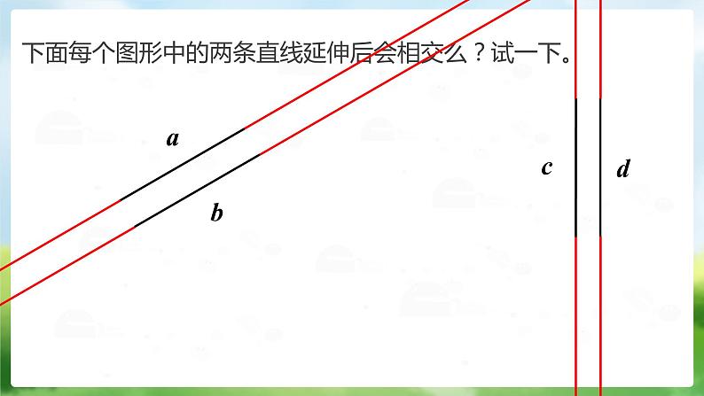 下面每个图形中的两条直线延伸后会相交么?试一下。