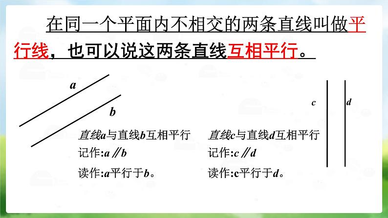 在同一个平面内不相交的两条直线叫做平行线,也可以说这两条直线互相平行。