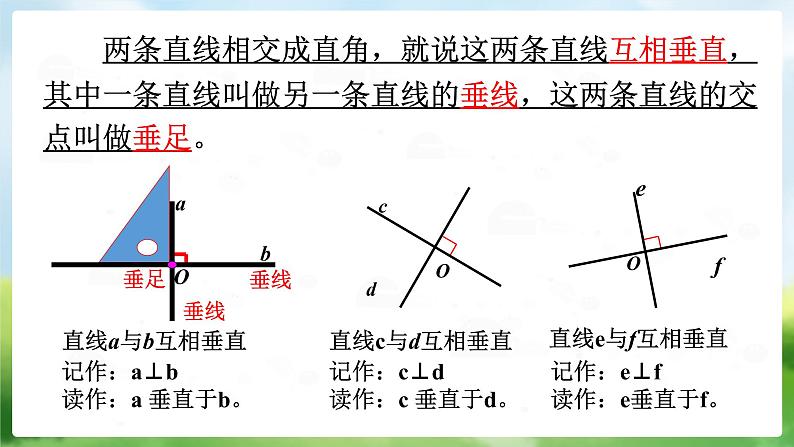 两条直线相交成直角,就说这两条直线互相垂直,其中一条直线叫做另一条直线的垂线,这两条直线的交点叫做垂足。