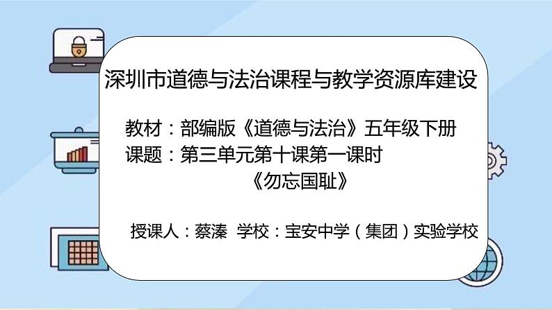 深圳市道德与法治课程与教学资源库建设 教材:部编版《道德与法治》五年级下册 课题:第三单元第十课第一课时 《勿忘国耻》 授课人:蔡溱 学校:宝安中学(集团)实验学校