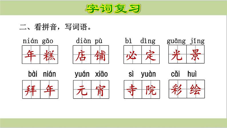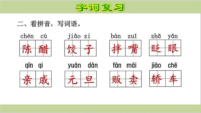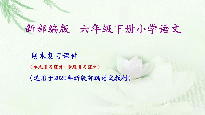 这是一份期末总复习(课件)六年级上册语文 统编版,共60页。PPT课件主要包含了读出加点生字的读音,多音字组词,A渲染xuàn,蒙古包měng,单薄bó,妩媚fǔ,迂回yū,B芭蕉bā,摇曳yì,衣襟jīng等内容,欢迎下载使用。