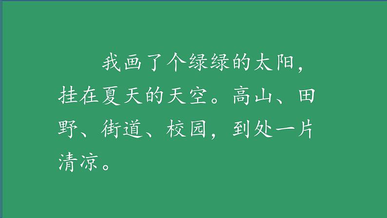 展开我画了个绿绿的太阳,挂在夏天的天空。高山、田野、街道、校园,到处一片清凉。