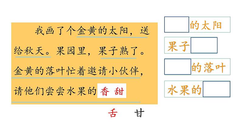 我画了个金黄的太阳,送给 秋天。果园里,果子熟了。金黄 的落叶忙着邀请小伙伴,请他们 尝尝水果的香甜。