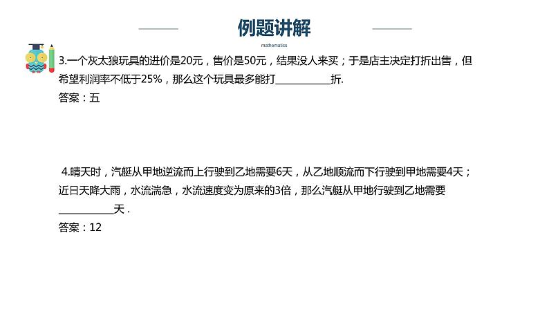 3.一个灰太狼玩具的进价是20元,售价是50元,结果没人来买;于是店主决定打折出售,但希望利润率不低于25%,那么这个玩具最多能打____________折.答案:五 4.晴天时,汽艇从甲地逆流而上行驶到乙地需要6天,从乙地顺流而下行驶到甲地需要4天;近日天降大雨,水流湍急,水流速度变为原来的3倍,那么汽艇从甲地行驶到乙地需要____________天 .答案:12