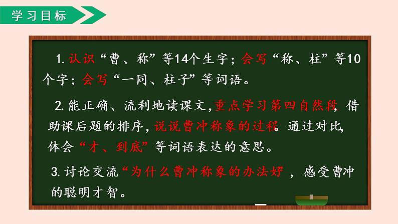 2.能正确、流利地读课文,重点学习第四自然段,借 助课后题的排序,说说曹冲称象的过程。通过对比, 体会“才、到底”等词语表达的意思。