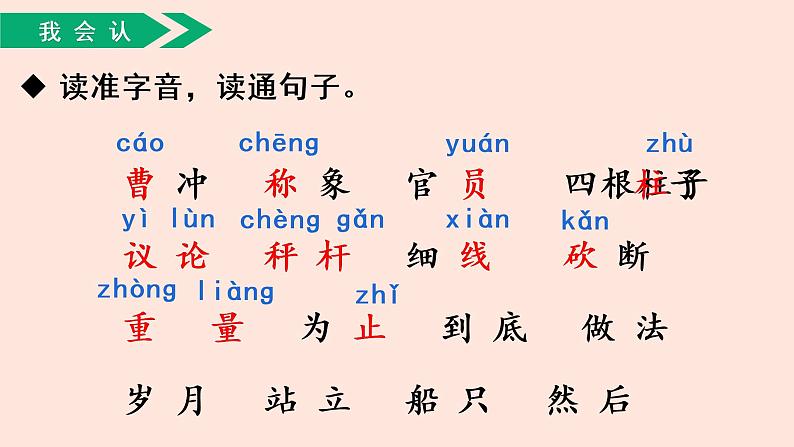 1.认识“曹、称”等14个生字;会写“称、柱”等10个字;会写“一同、柱子”等词语。