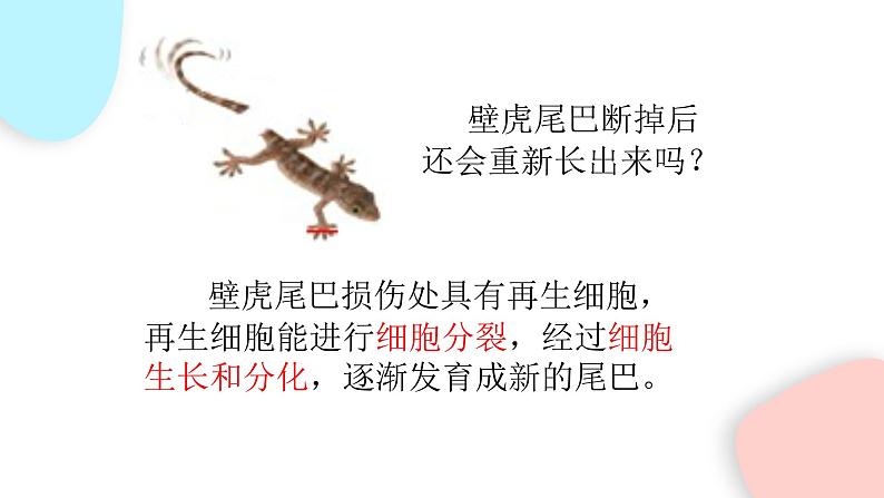 壁虎尾巴损伤处具有再生细胞,再生细胞能进行细胞分裂,经过细胞生长和分化,逐渐发育成新的尾巴。