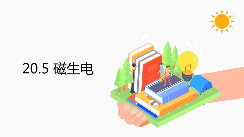 初中物理第五节 磁生电教学演示课件ppt: 这是一份初中物理第五节 磁生电教学演示课件ppt,共12页。PPT课件主要包含了磁生电,第二十章第5节,实验器材,设计实验,电流表,交变电流,发电机,电动机等内容,欢迎下载使用。