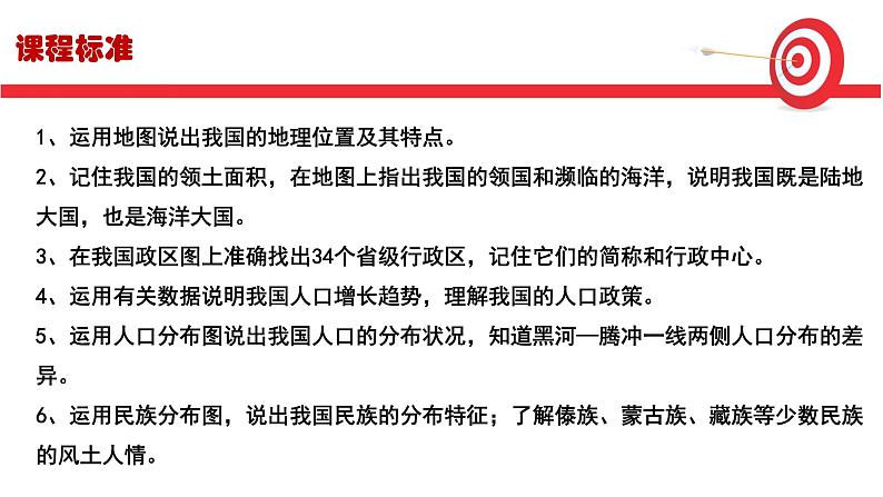 展开1、运用地图说出我国的地理位置及其特点。2、记住我国的领土面积,在地图上指出我国的领国和濒临的海洋,说明我国既是陆地大国,也是海洋大国。3、在我国政区图上准确找出34个省级行政区,记住它们的简称和行政中心。4、运用有关数据说明我国人口增长趋势,理解我国的人口政策。5、运用人口分布图说出我国人口的分布状况,知道黑河—腾冲一线两侧人口分布的差异。6、运用民族分布图,说出我国民族的分布特征;了解傣族、蒙古族、藏族等少数民族的风土人情。