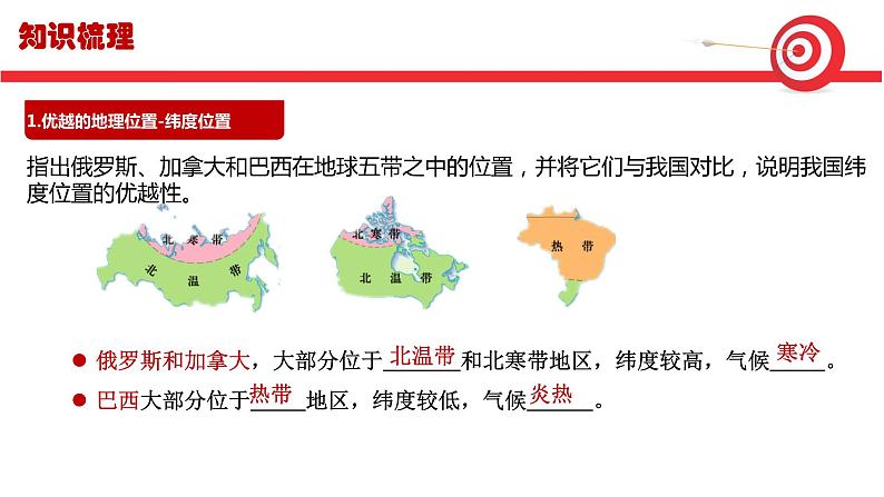 指出俄罗斯、加拿大和巴西在地球五带之中的位置,并将它们与我国对比,说明我国纬度位置的优越性。