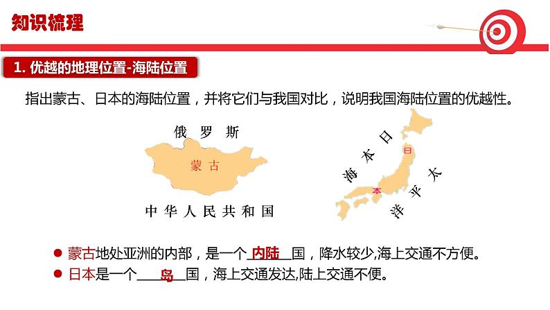 指出蒙古、日本的海陆位置,并将它们与我国对比,说明我国海陆位置的优越性。