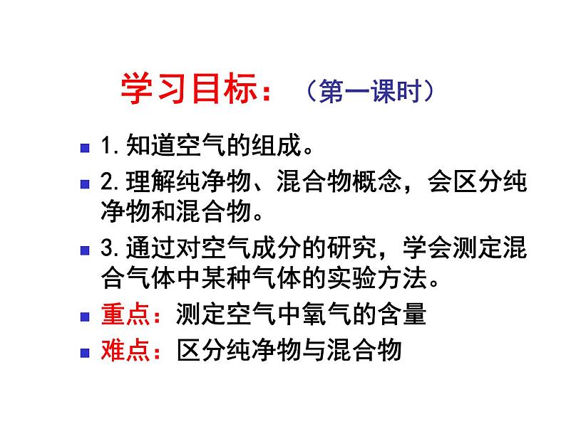 1.知道空气的组成。2.理解纯净物、混合物概念,会区分纯净物和混合物。3.通过对空气成分的研究,学会测定混合气体中某种气体的实验方法。重点:测定空气中氧气的含量 难点:区分纯净物与混合物