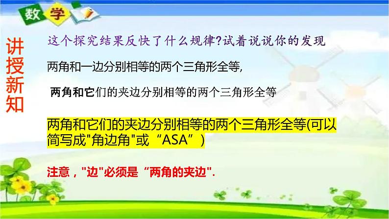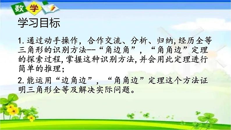 1.通过动手操作,合作交流、分析、归纳,经历全等三角形的识别方法--“角边角”,“角角边”定理的探索过程,掌握这种识别方法,并会用此定理进行简单的推理;2.能运用“边角边”,“角角边”定理这个方法证明三角形全等及解决实际问题。