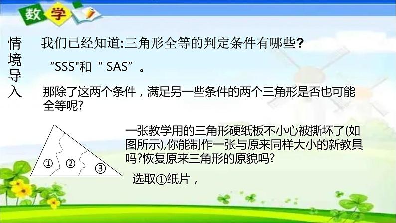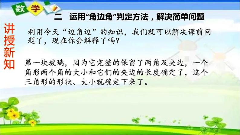 第一块玻璃,因为它完整的保留了两角及夹边,一个角形两个角的大小和它们的夹边的长度确定了,这个三角形的形状、大小就确定下来了。