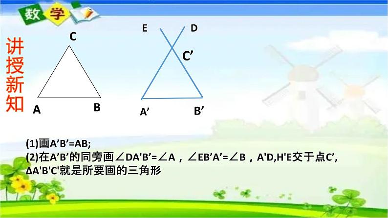 (1)画A’B’=AB;(2)在A’B’的同旁画∠DA'B’=∠A,∠EB’A’=∠B,A'D,H'E交于点C’,ΔA'B'C'就是所要画的三角形